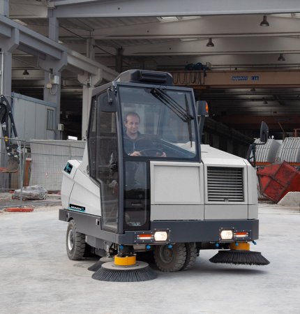 The driving position at the front of the machine, together with an automotive steering system and controls, and front wheel steering, make this powerful sweeper particularly intuitive to drive.